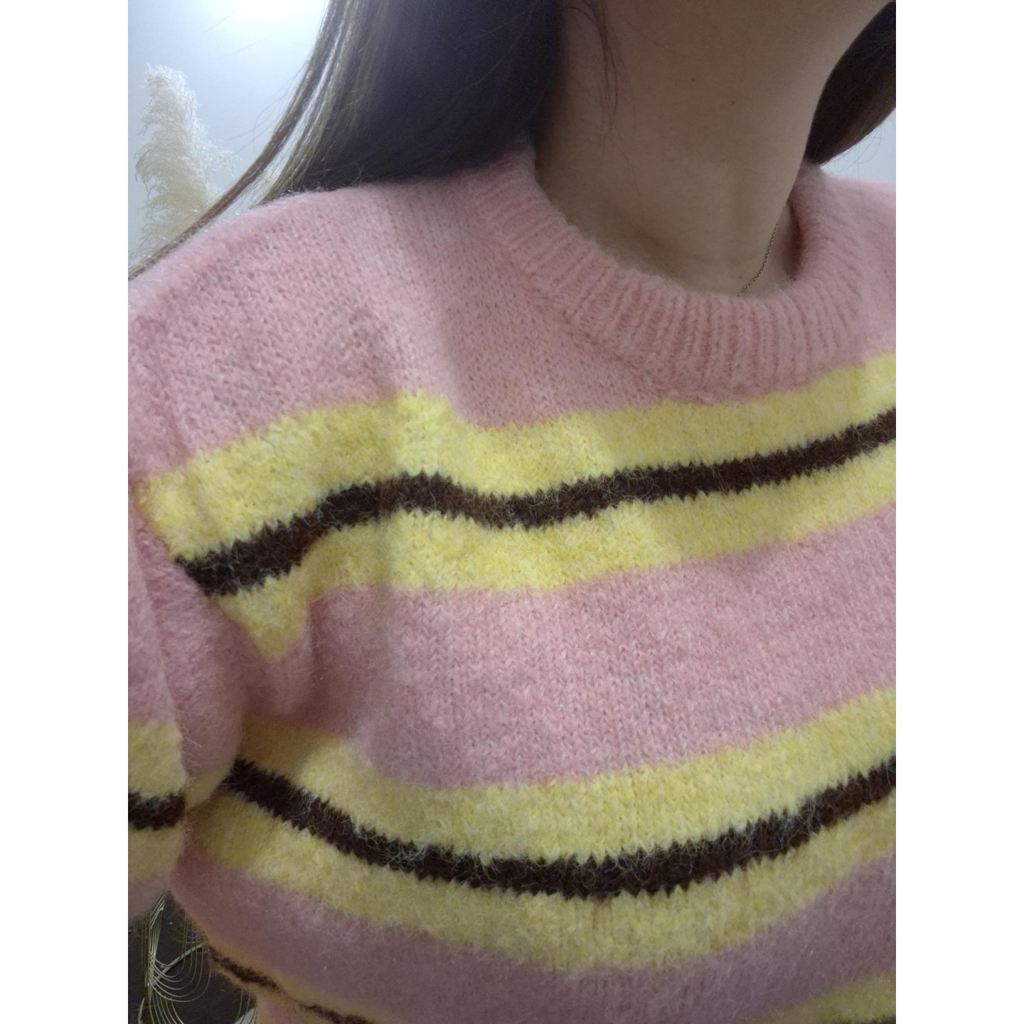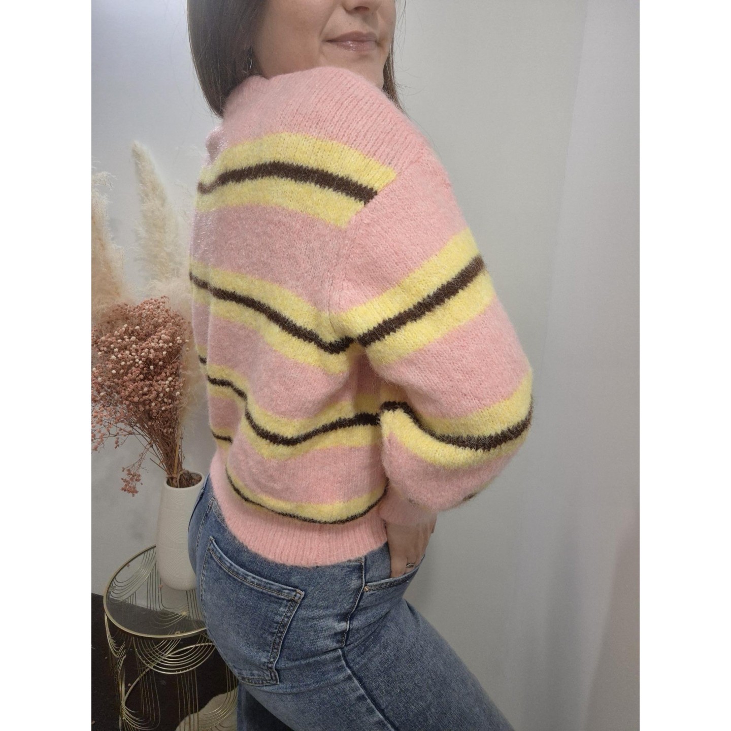 Pull rose rayé, marron & jaune